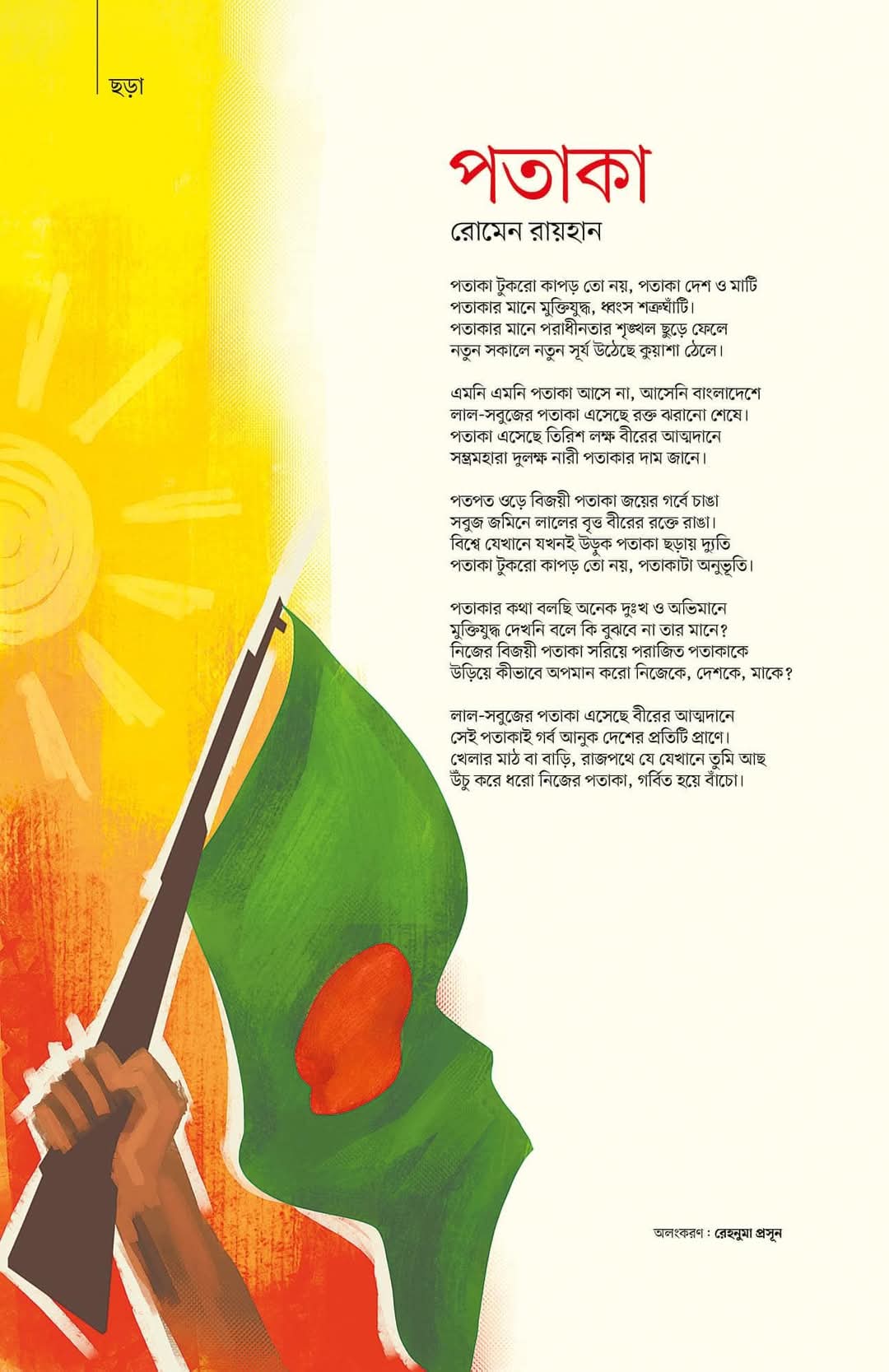স্বাধীন বাংলাদেশের গৌরবজ্বল উপাখ্যানের অন্যতম ধারক ও বাহক গণপ্রজাতন্ত্রী বাংলাদেশের জাতীয় পতাকা। লাল-সবুজের রন্ধ্রে রন্ধ্রে লুকিয়ে আছে বাংলাদেশীদের অপরিমেয় আত্মত্যাগ ও বীরত্বের কাহিনী। প্রাক্তন থেকে বর্তমান পতাকার আগমনযাত্রা সাক্ষী হয়েছে রক্তক্ষয়ী এক অধ্যায়ের। বাংলাদেশের সার্বভৌমত্ব, গৌরব, জাতীয়তা আর মহান আত্মত্যাগ মিশে রয়েছে জাতীয় পতাকার লাল-সবুজে।